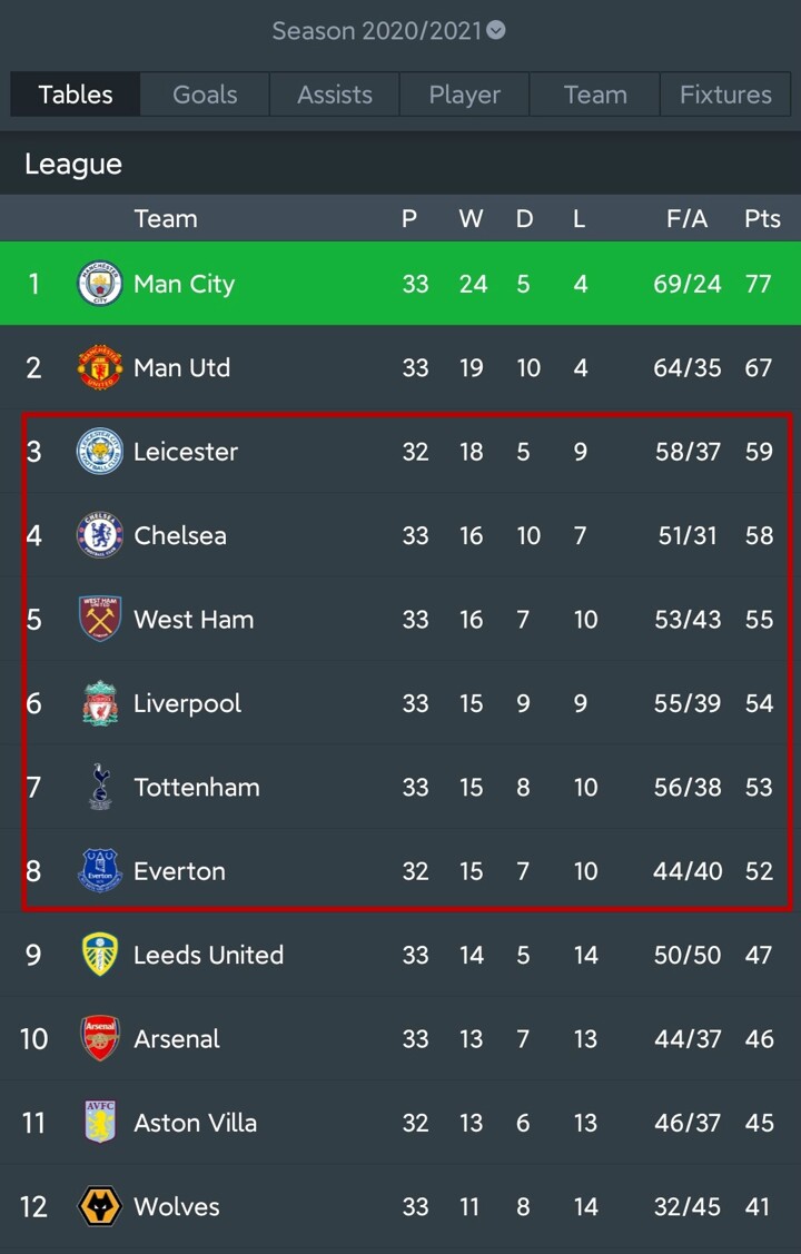 Foxes, Blues, Hammers, Reds, Spurs and Toffees, they all have a chance to finish it and qualify for Champions League, let's check out the current EPL table and the remaining fixtures for these clubs.